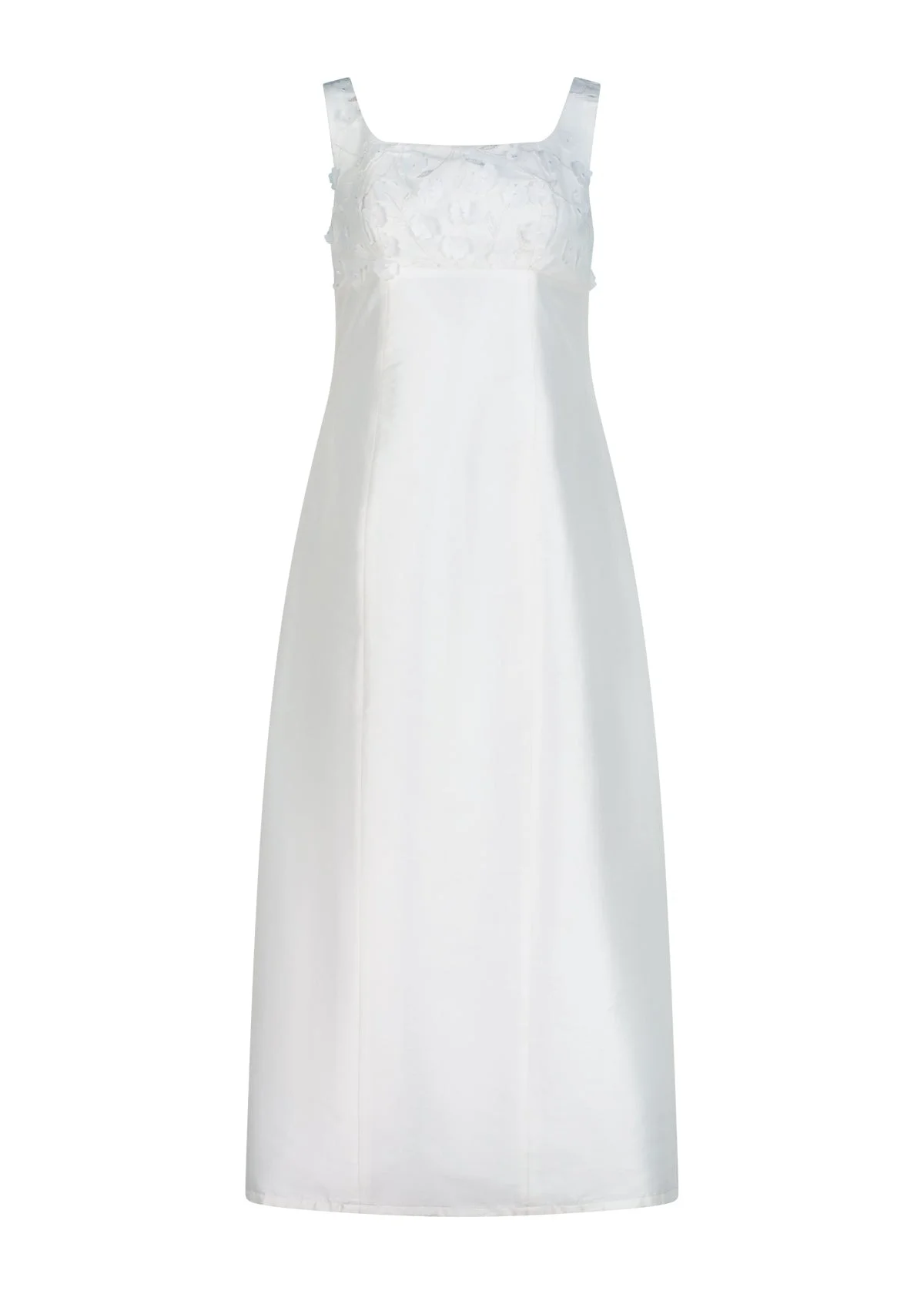 Crafted from structured Dutch satin, this white dress features a clean, elongated silhouette with delicate floral accents along the neckline. Part of the FW25 collection. A versatile choice for the contemporary bride: elegant, modern, and wearable beyond the ceremony.