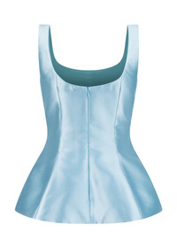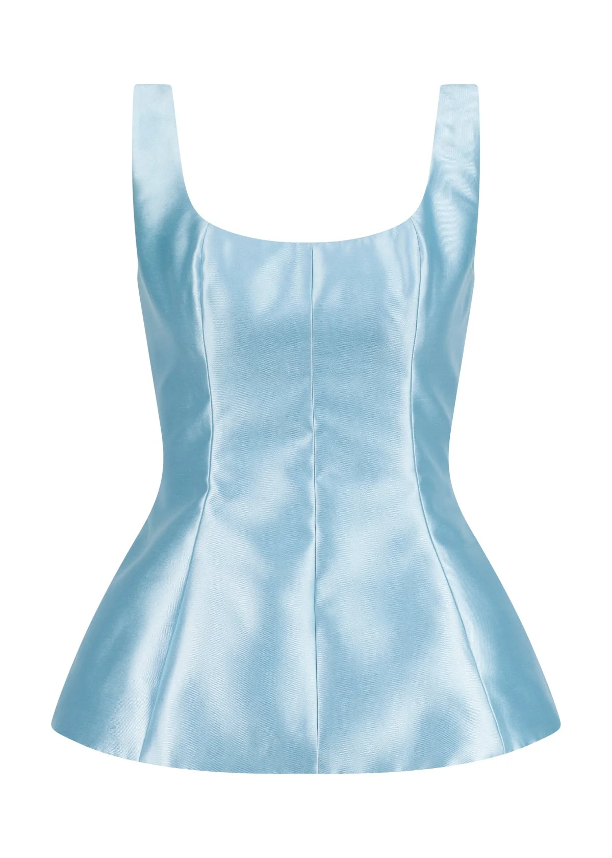 The Ivy Top continues to blend structure with softness. Its fitted bodice and flared peplum hem define the waist, while the crisp square neckline frames the collarbone with ease. Also available in ivory satin, the Ivy Top takes on a softer, more romantic tone. The structured bodice and flared peplum remain, offering a sculpted silhouette, while the cool-toned satin brings a subtle shine.