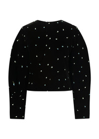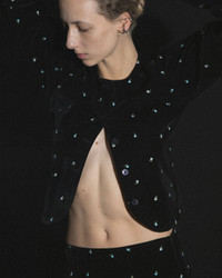 Our Jackie set returns in a new season’s finish, soft black velvet embroidered with blue florals. The cropped jacket features a rounded neckline and puffed sleeves, paired with a clean-cut mini skirt for a silhouette that’s both playful and composed. A timeless shape, reimagined in richer texture and mood for FW25.