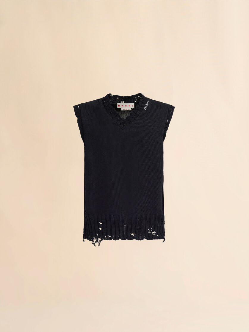 Sleeveless V-neck jumper. Cotton stocking stitch design. Wide ribbed trims with dishevelled detailing. Regular fit. Hand-stitched Marni mending logo with flower detail on the neckline. The main fiber in this garment is made using at least 50% of highly selected organic cotton, grown using farming practices that support biodiversity and healthy ecosystems. Made in Italy MODEL CVMG0091A0UFC65200N99 COMPOSITION Primary Fabric: 100% Cotton Knit