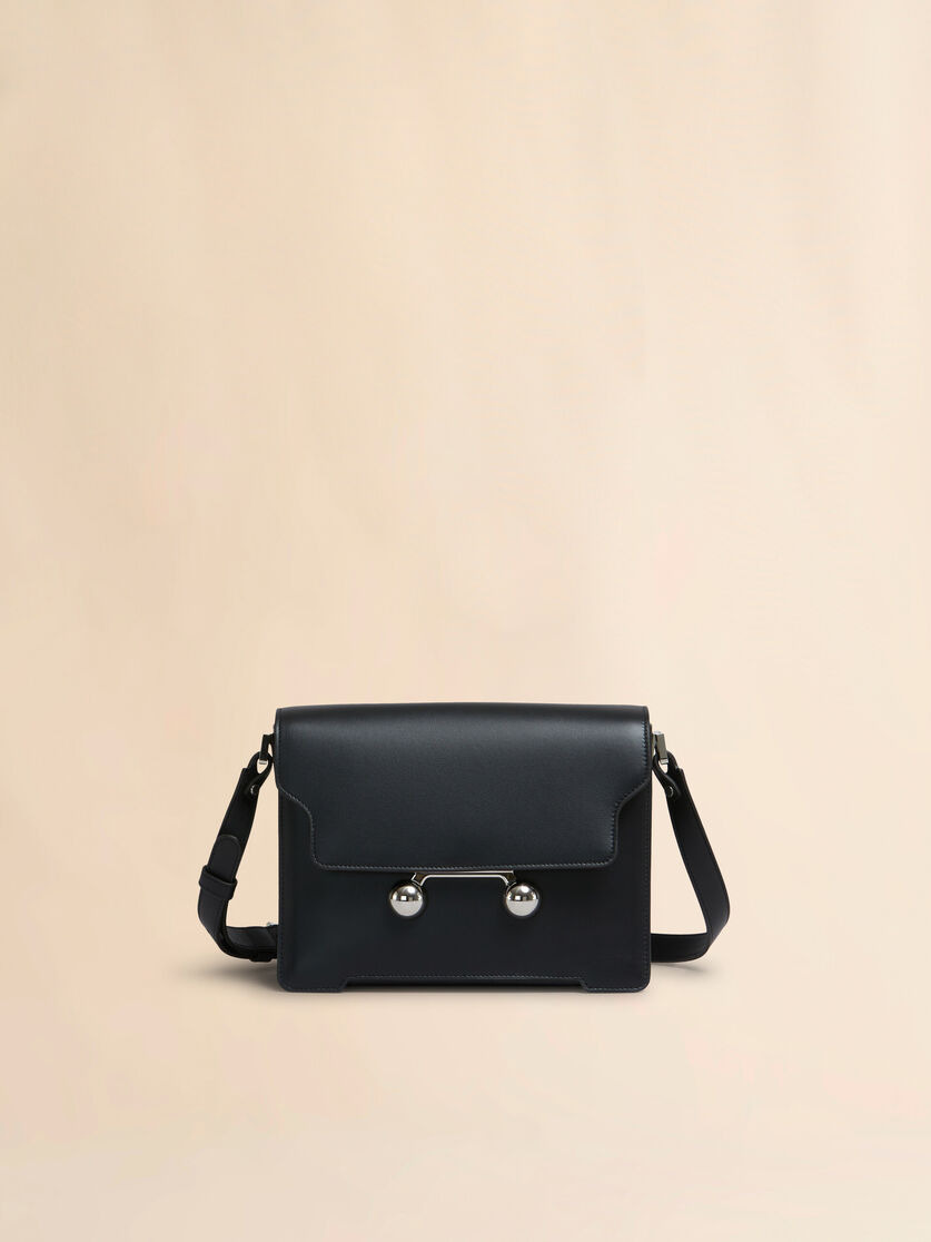 Trunkaroo medium rectangular shoulder bag crafted from calfskin leather. Front flap with magnetic closure, featuring engraved Marni lettering and oversized stud details. Contoured base on the front and back. One compartment with inside pocket. Lined in nappa leather. Detachable and adjustable buckled shoulder strap: can also be worn as a clutch. Made in Italy MODEL SBMQ0107U0P694800N99 COMPOSITION Body: 100% Calf Leather - Lining: 100% Ovine Leather - Metallic Parts: 100% Brass - Metallic Parts: 100% Steel