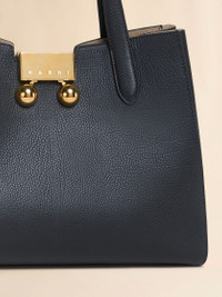Trunkaroo Tote bag made of pebbled calf leather. Small size. Double handle and adjustable, removable leather shoulder strap. Oversized magnetic closure featuring engraved Marni lettering and two visually impactful metal stud details. Accordion-style design with suede interior and central zip pocket. Gold hardware. This product is made using leather from a Leather Working Group medalled tannery. LWG supports more responsible leather manufacturing across the globe. Made in Italy MODEL BMMP0150U0P818500N99 COMPOSITION Body: 100% Calf Leather - Contrast: 100% Calf Leather - Inside: 100% Calf Leather - Lining: 100% Calf Leather - Metallic Parts: 100% Zama - Metallic Parts: 100% Brass - Metallic Parts: 100% Steel