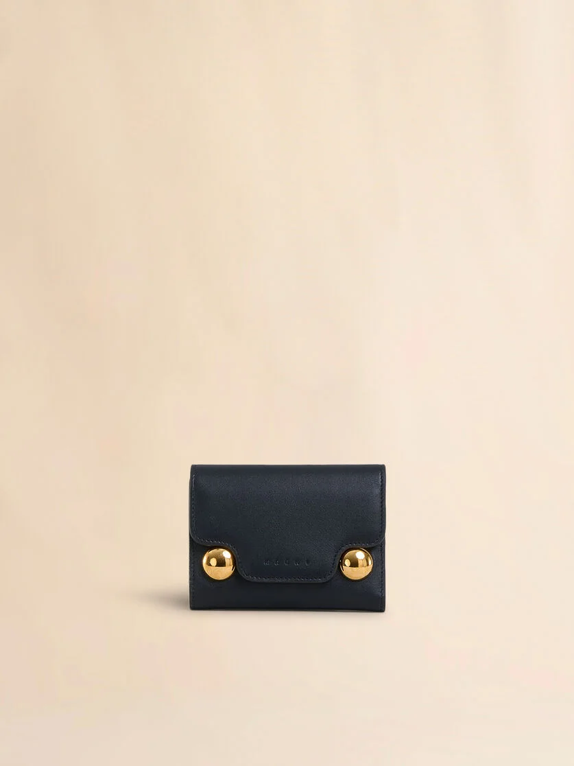 Trunkaroo trifold wallet crafted from calfskin leather. Embossed Marni lettering and oversized stud details. Snap button closure. Zip coin pocket, note compartment, and six card slots. Made in Italy MODEL PFMO0109U0P694800N99 COMPOSITION Body: 100% Calf Leather - Lining: 100% Ovine Leather - Lining: 100% Viscose-Rayon - Metallic Parts: 100% Brass - Metallic Parts: 100% Brass - Metallic Parts: 100% Zama