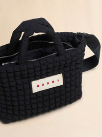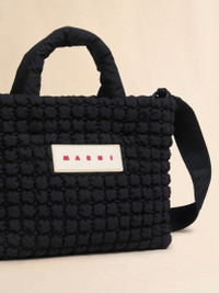Puff nylon shopper, stitched with intricate puckering to create a bubble-wrap effect. Small size. Padded handles and generously cushioned sides. Zip closure and adjustable tape shoulder strap: can be worn as a crossbody or handbag. Rubber Marni label stitched on the front. Made in Italy MODEL BMMP0131U5P856200N99 COMPOSITION Body: 46% Polyester 33% Polyamide-Nylon 21% Cotton - Contrast: 100% Calf Leather - Application: 100% Polyurethane - Contrast: 100% Polyester - Lining: 100% Polyamide-Nylon - Metallic Parts: 100% Brass - Metallic Parts: 100% Zama - Metallic Parts: 100% Polyamide-Nylon - Padding: 100% Polyester