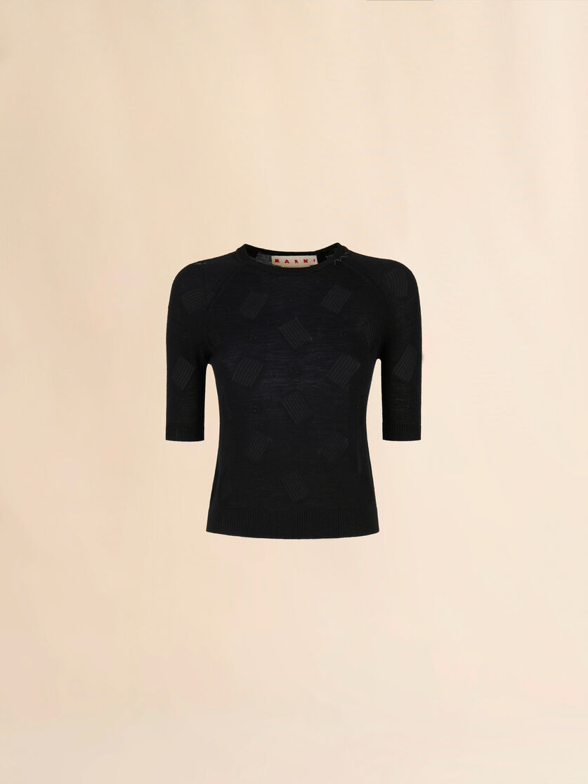 Crew-neck top knitted from a wool and silk blend. Short tight-fitting sleeves. All-over geometric openwork motif. Openwork ribbed trims. Hand-stitched Marni Symbol on the left side of the neckline. MODEL GCMD0596E0UFW53400N99 COMPOSITION Primary Fabric: 70% Virgin Wool Knit 30% Silk Knit