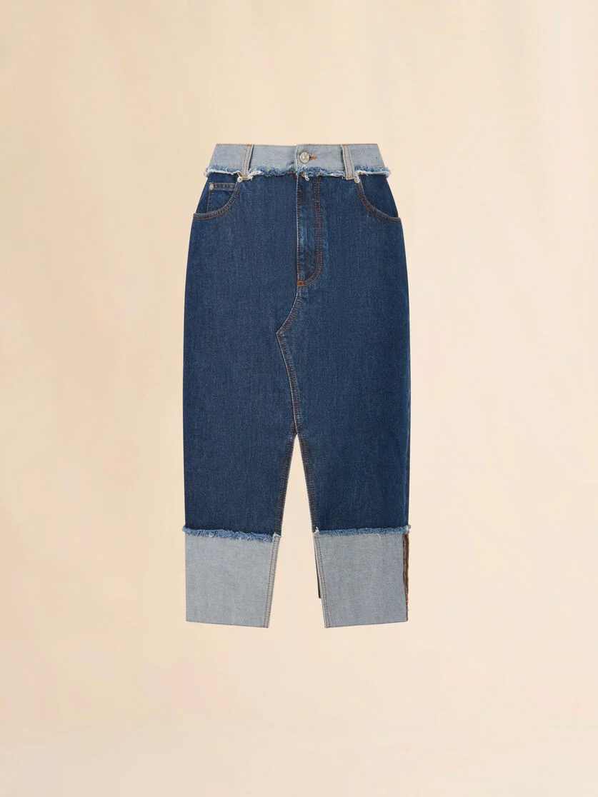 Midi skirt made from unwashed indigo denim. Reverse waist and cuffs for an inside-out look. Finished with tobacco stitching and a stone-washed treatment to reveal naturally frayed edges. Straight cut with front and back slits. Embroidered "M" on the back pocket. Printed Marni leather patch on the back waist. Made in Italy MODEL GOJD0807SQUSCY68WSB99