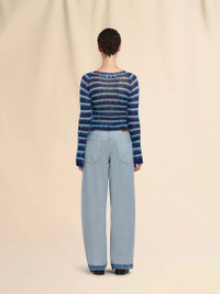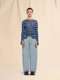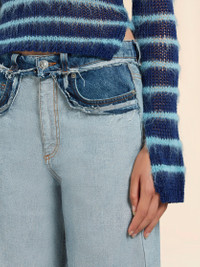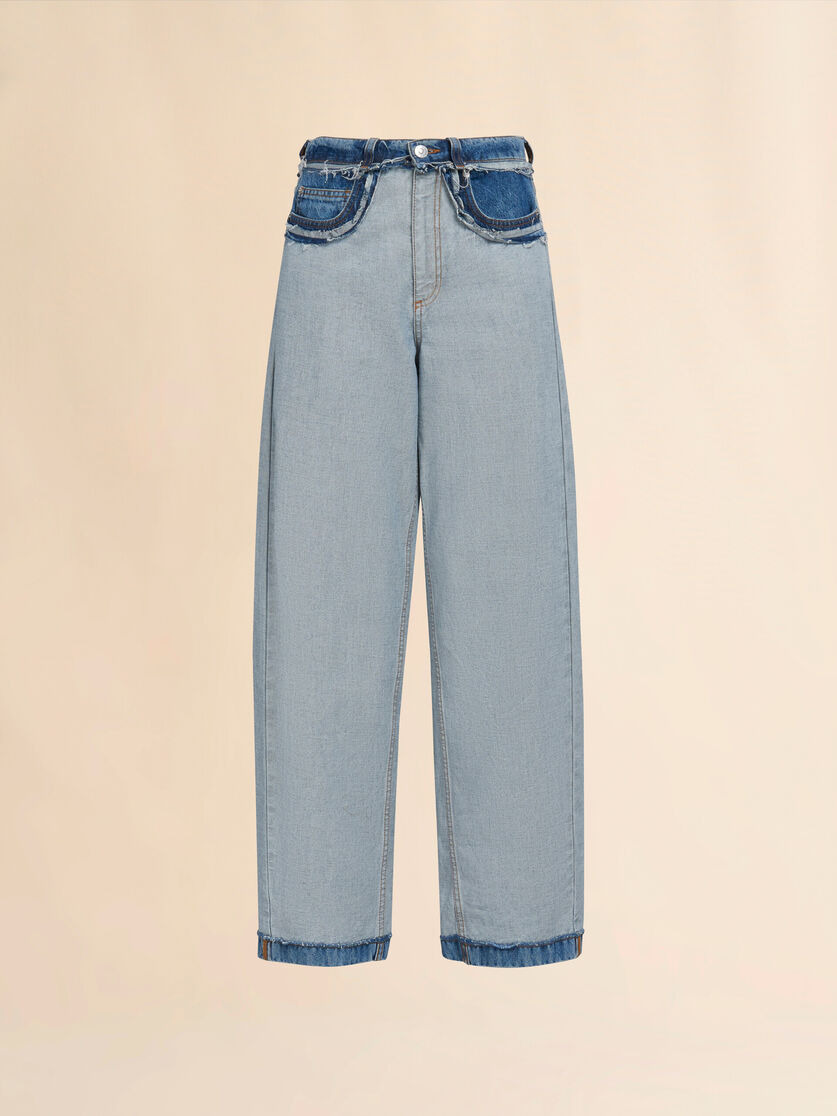 5-pocket jeans made from stonewashed organic bull denim. Inside out design with raw-cut edges at the waist and hip pockets. Carrot fit with low waist. Finished with embroidered Marni lettering on the back pocket and a leather logo patch. Made in Italy MODEL PAJD0474SQUSCV93IOB52 FIT The model is 5' 10''. The model is wearing size 40 IT. COMPOSITION Primary Fabric: 100% Cotton Woven - Secondary Fabric: 100% Cotton Woven - Pocket Lining: 65% Polyester Woven 35% Cotton Woven - Application: 100% Calf Leather