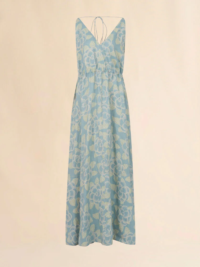BLUE RAMIE MAXI DRESS WITH BANJO PRINT