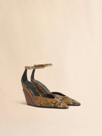 Pointed-toe wedge pump made from panels of python, crocodile, and eel-printed leather in a mesmerizing dance of textures and colors. Leather sole. Adjustable ankle strap with silver buckle. Made in Italy MODEL PUMS013609P9095ZP013
