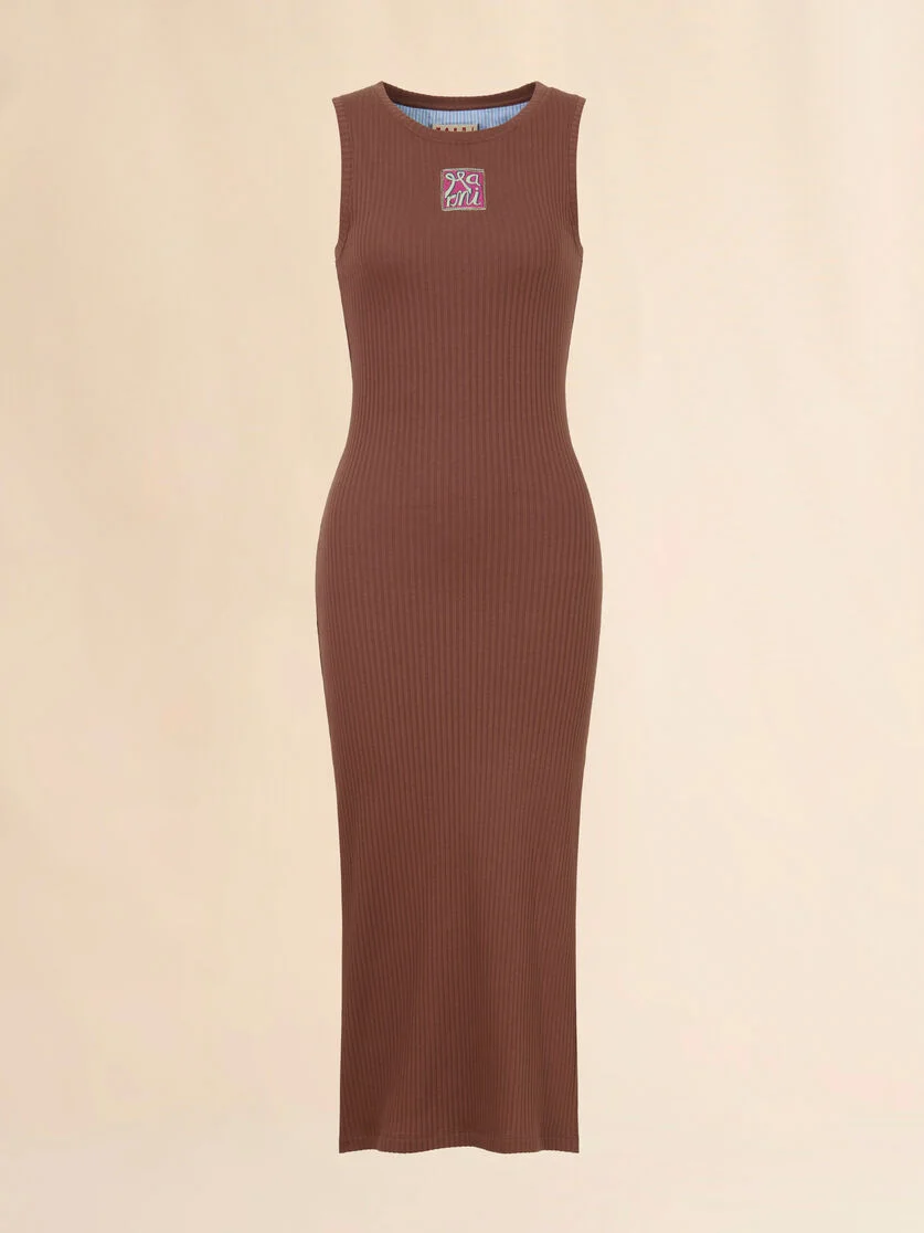BROWN RIBBED COTTON MIDI DRESS WITH MARNI FRAME LOGO