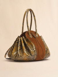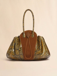 Tulipea large bag made from soft suede and supple python-print leather. Crafted with a rigid central body and flexible unlined bellows shape at the sides evoking the delicate opening of a bud. Tubular top handles and detachable shoulder strap with D-rings and studs. Hot-stamped Marni logo on the front. Drawstring closure with crocodile-print leather fastening and faux suede lining. Made in Italy MODEL SBMP0263A2P8712ZP027