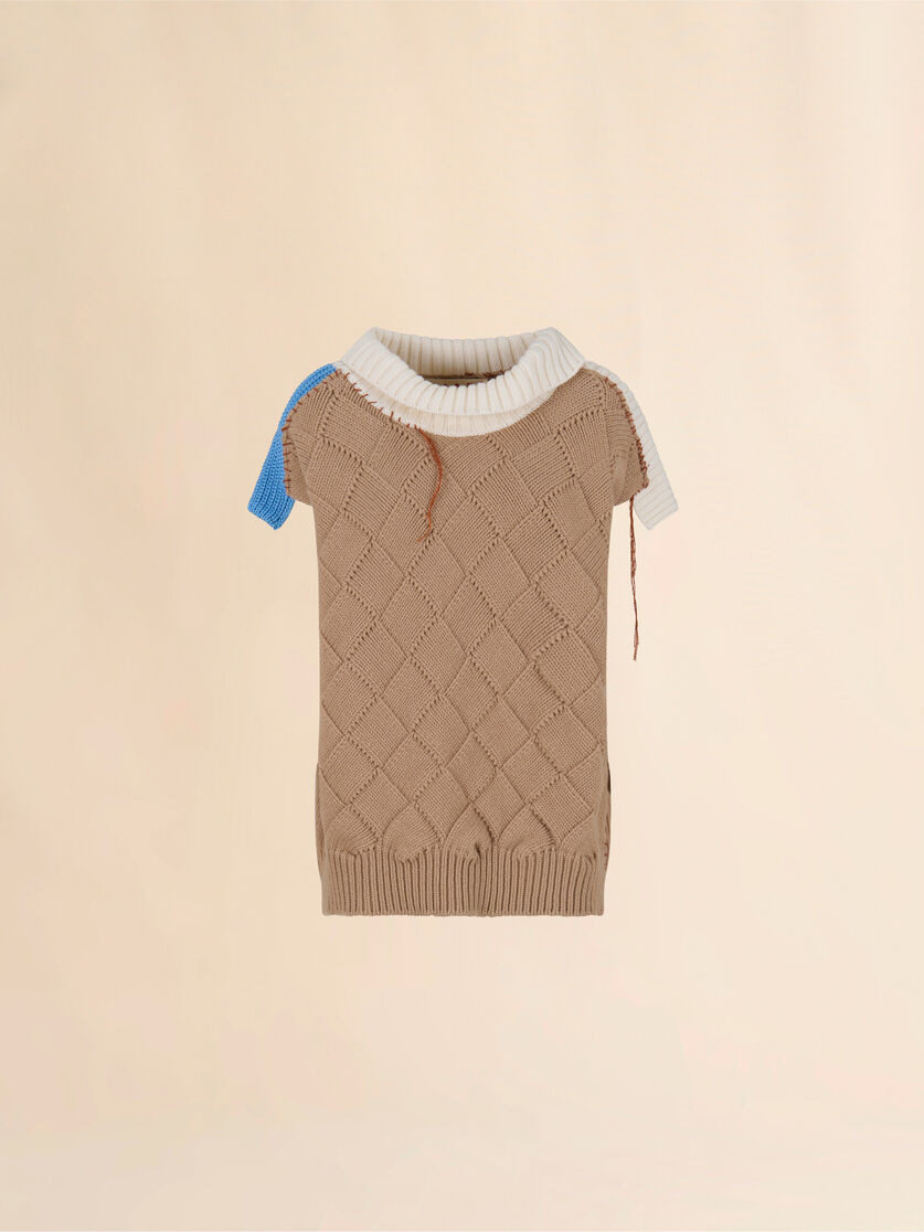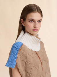 Sleeveless turtleneck sweater knitted from a mix of soft Shetland wool and cotton. Contrasting ribbed and rhombus-knit panels, assembled with Marni Mending stitches and logo in contrast yarn. Left with hanging threads and uneven edges. Oversized fit. Made in Italy MODEL DVMD0199Q0UFWH28MXW36