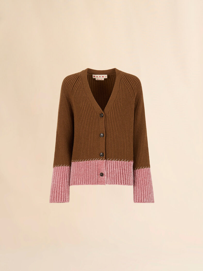 BROWN WOOL COLOR-BLOCK CARDIGAN