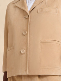 Relaxed-fit boxy jacket made from suede with a remarkably light, silky texture. Single-breasted closure with three buttons. 3/4 sleeves. Three front pockets. Hand-stitched Marni Symbol on the shoulder. Made in Italy MODEL GIMX0129MSULV88100C15 COMPOSITION Primary Fabric: 100% Ovine Leather - Lining: 69% Cotton Woven 31% Polyamide Woven - Pocket Lining: 100% Cotton Knit - Application: 100% Calf Leather