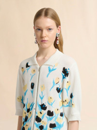 Short-sleeved cardigan knitted from cotton, printed with a freehand-effect floral design on the front evoking hand-painted artwork. Regular fit with zip closure and polo collar. Ribbed cuffs and hem. Made in Italy MODEL CDMD0449P0UFCN57FLY16