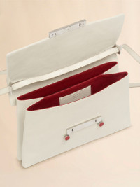 Medium Envelope bag made from patent leather with a tactile craquele effect. Semi-rigid construction with two inside compartments. Open pocket in the front one, zip pocket in the back. Adjustable buckled shoulder strap: can be worn as a shoulder bag or crossbody. Flap closure with enamelled Marni clasp. Luxurious sheepskin leather lining. Made in Italy MODEL SBMP0228U0P828700W04 COMPOSITION Body: 100% Calf Leather - Contrast: 100% Calf Leather - Lining: 100% Ovine Leather - Metallic Parts: 100% Brass - Metallic Parts: 100% Zama
