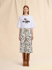 Midi skirt made from envers satin, printed with a delicate motif of tulips and jumping hares. Straight cut with front gathering, rear slit and ruffle hem. Concealed back zipper closure. Made in Italy MODEL GOMA0768A0UTVA52THW04 COMPOSITION Primary Fabric: 100% Viscose-Rayon Woven