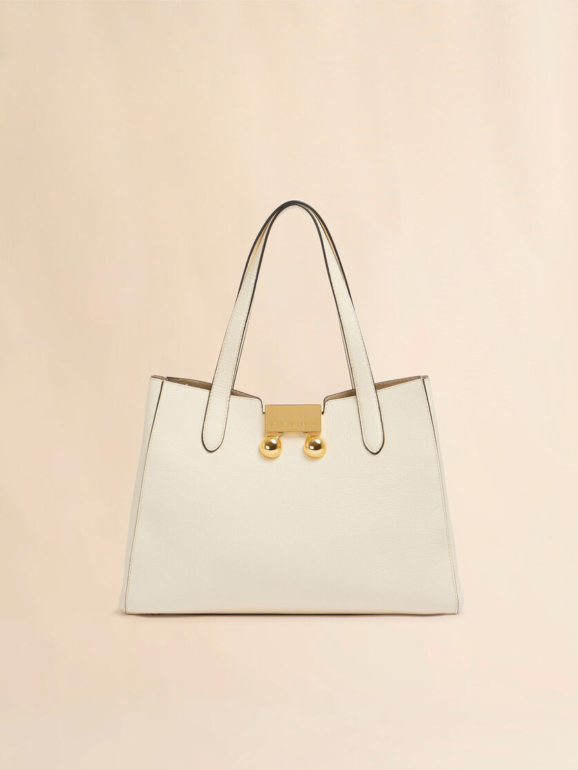 Trunkaroo Tote bag made of pebbled calf leather. Small size. Double handle and adjustable, removable leather shoulder strap. Oversized magnetic closure featuring engraved Marni lettering and two visually impactful metal stud details. Accordion-style design with suede interior and central zip pocket. Gold hardware. Made in Italy MODEL BMMP0150U0P818500W12 COMPOSITION Body: 100% Calf Leather - Contrast: 100% Calf Leather - Inside: 100% Calf Leather - Lining: 100% Calf Leather - Metallic Parts: 100% Zama - Metallic Parts: 100% Brass - Metallic Parts: 100% Steel