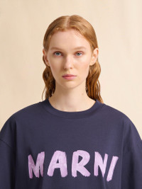 Short-sleeved crew-neck T-shirt made from organic cotton jersey. Boxy fit with short sleeves. Maxi brushstroke Marni logo on the chest. MODEL THJET49EPHUSCS11L2B99 FIT The model is 5' 9.5''. The model is wearing size 40 IT. COMPOSITION Primary Fabric: 100% Cotton Knit CARE INSTRUCTION Hand wash. Do not bleach. Low iron. Do not dry clean. Do not tumble dry.