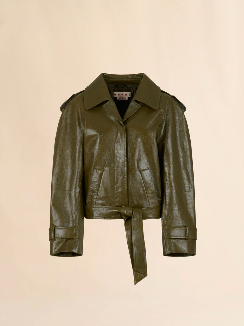 Short trench coat made from shiny goatskin nappa leather. Cocoon silhouette with classic storm shield and shoulder tabs, elevated with a maxi lapel collar and adjustable tie at the hem. Concealed button closure. Welt pockets. Embossed Marni patch on the back. Lined. Made in Italy MODEL JKMX0363U0ULG15300V58 COMPOSITION Leather: 100% Goat Leather - Lining: 100% Viscose-Rayon - Application: 100% Goat Leather - Application: 100% Calf Leather