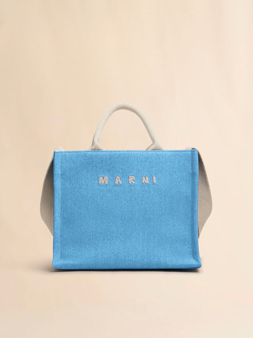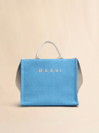 Basket shopper made from organic denim, softened with a super-stonewash treatment. Small size. Tape top handles and shoulder strap. Embroidered Marni logo. Ecru drill lining with logo applique. Made in Italy MODEL SHMP0077U2P853600B60 COMPOSITION Body: 100% Cotton - Contrast: 97% Cotton 3% Polyester - Contrast: 100% Calf Leather - Lining: 95% Cotton 5% Acrylic - Metallic Parts: 100% Brass