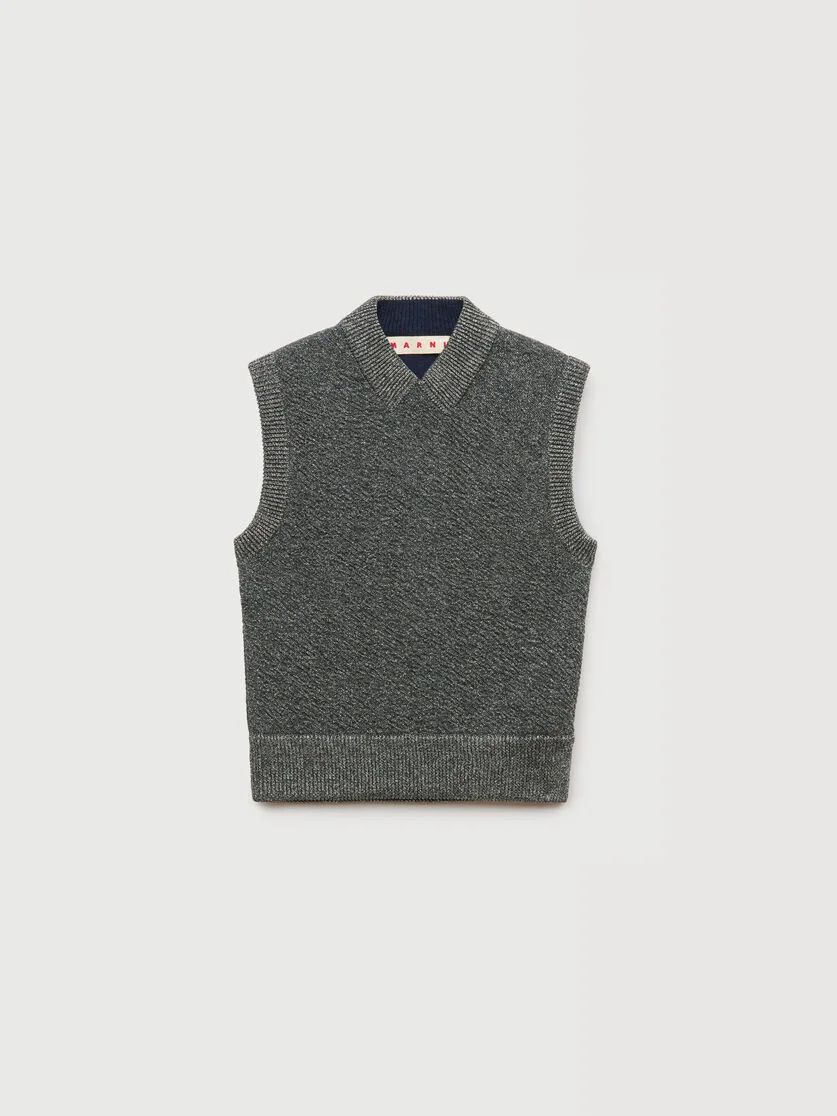 Sweater vest made from virgin wool, enhanced with shimmering lurex integrated into the knit. Shirt collar and ribbed trims. MODEL CVMD0168Q0UFH55600N77