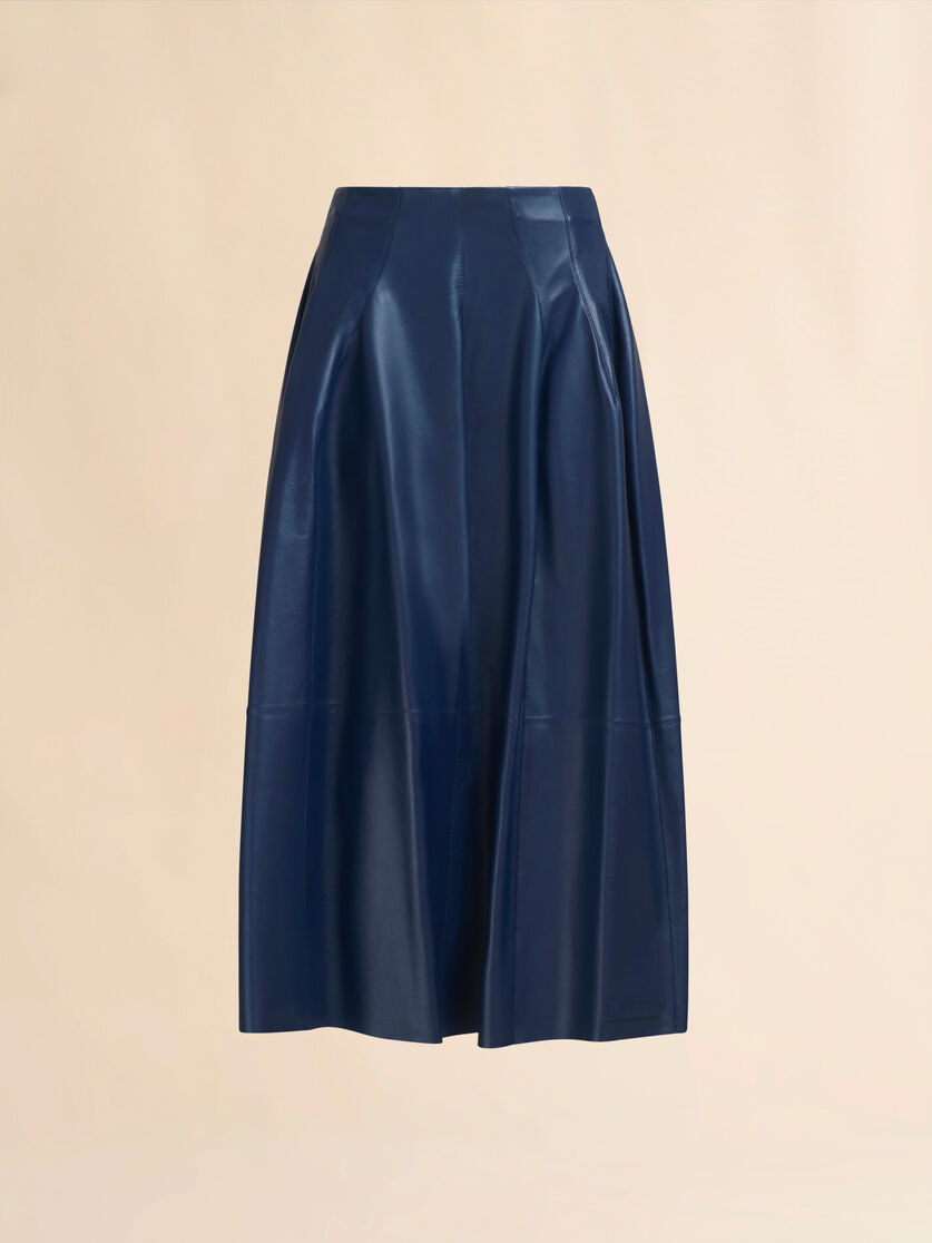 Midi skirt in soft smooth nappa. Wide fit with high waist and vertical cut pattern on the front and back. Unlined. Zip closure on the back. Finished with a leather label with embossed Marni logo. Made in Italy MODEL GOMX0605A1ULA73600B61 FIT The model is 5' 9''. The model is wearing size 40 IT. COMPOSITION Leather: 100% Ovine Leather - Application: 100% Ovine Leather