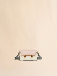 Trunkaroo rectangular mini shoulder bag crafted from calfskin leather. Colour block design. Front flap with magnetic closure, featuring engraved Marni lettering and oversized stud details. Contoured base on the front and back. One compartment with inside pocket. Lined in nappa leather. Detachable and adjustable buckled shoulder strap: can also be worn as a clutch. This product is made using leather from a Leather Working Group medalled tannery. LWG supports more responsible leather manufacturing across the globe. Made in Italy MODEL SBMP0193U1P6948ZO878 COMPOSITION Body: 100% Calf Leather - Lining: 100% Ovine Leather - Metallic Parts: 100% Brass - Metallic Parts: 100% Steel