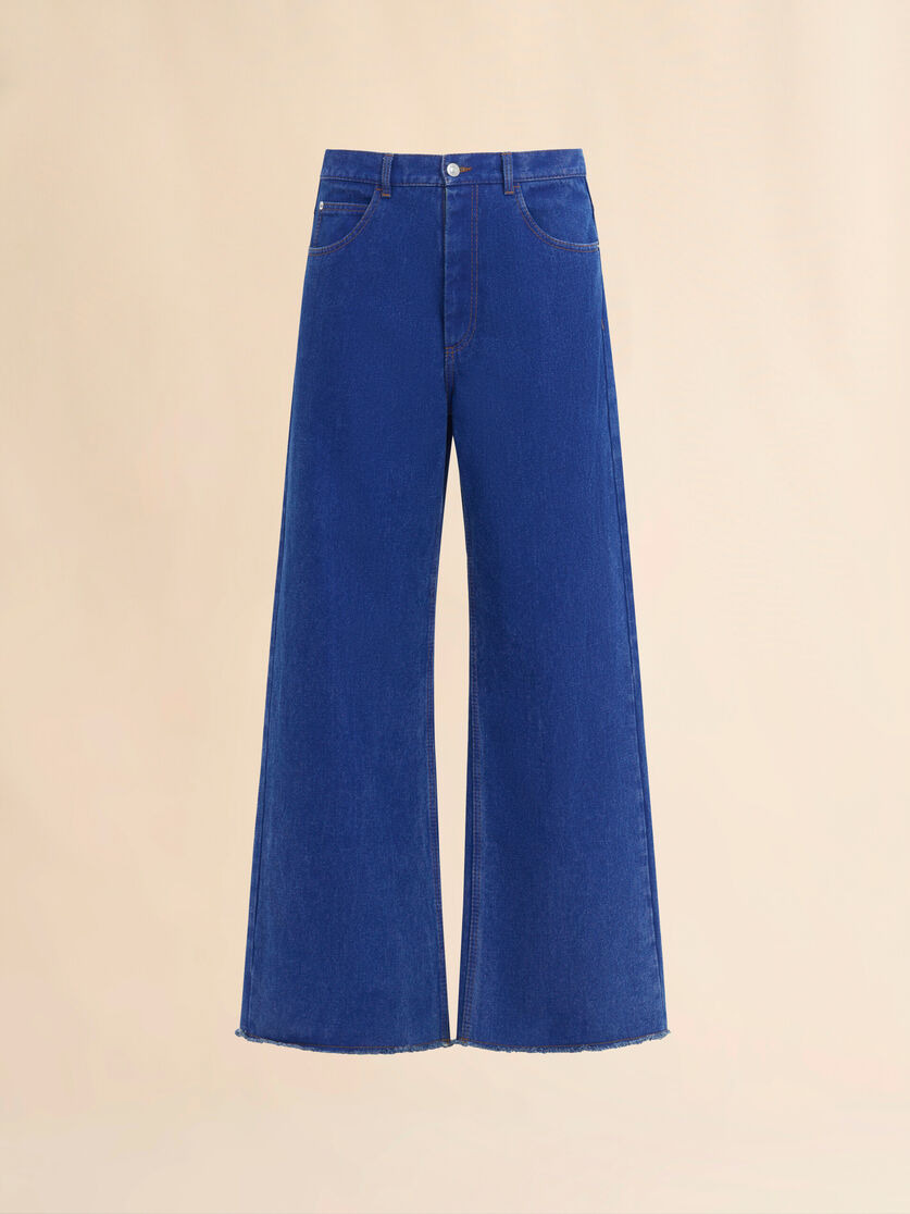Bleached organic denim 5-pocket trousers. Relaxed fit with low waist. Raw cut hem and matching red ribbon belt. Zip and tack button closure. Leather label with red Marni logo at the back of the waist. Made in Italy MODEL PUJU0019A1USCU83BDB60 FIT The model is 6' 2". The model is wearing size 32 IT. COMPOSITION 100% CO1