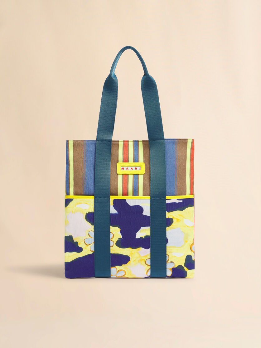 Tote bag made from soft cotton. The bright multicolour fabric has been sourced from the Marni archive as part of the upcycling project. Twin tape handles and leather accents. Lined in cotton. Embroidered Marni logo. Made in Italy MODEL SHMP0166U0P880900M28
