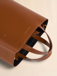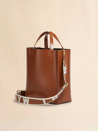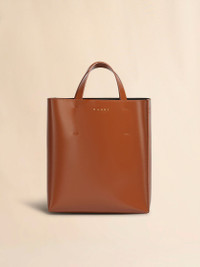 North/South Museo tote bag crafted from smooth calfskin leather. Small size. Inside open pocket with embroidered logo patch. Leather top handles. Detachable and adjustable recycled tape shoulder strap with Marni lettering. Gold hardware. Gold logo print on the front. Made in Italy MODEL SHMPV01TU0LV63900M66 COMPOSITION Body: 100% Calf Leather - Inside: 100% Calf Leather - Contrast: 100% Polyester - Lining: 55% Cotton 45% Polyurethane - Lining: 100% Cotton - Metallic Parts: 100% Zama - Metallic Parts: 100% Brass