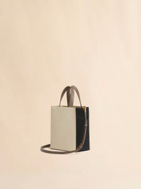 Museo North/South tote bag crafted from milled calfskin leather. Mini size. Colour-block design. Top handles and detachable and adjustable buckled shoulder strap. Open design with fabric lining and inside zip pocket. Hand-stitched Marni Mending logo on the front. Made in Italy MODEL SHMP0040L3P6533ZO830 COMPOSITION Body: 100% Calf Leather - Contrast: 100% Calf Leather - Contrast: 100% Polyester - Lining: 95% Cotton 5% Acrylic - Inside: 100% Calf Leather - Metallic Parts: 100% Brass - Metallic Parts: 100% Zama