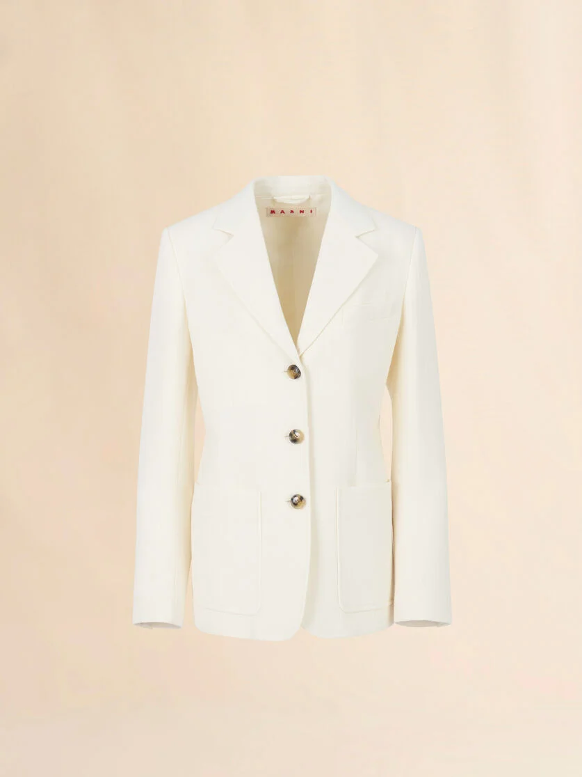 Single-breasted jacket crafted from double-faced wool crepe. Made using twisted yarn for natural elasticity. Regular fit with three buttons and back martingale detail. Upper welt pocket and lower flap pockets. Tonal stitching with hand-embroidered Marni Mending logo on the sleeve. Lined. Made in Italy MODEL GIMA0317SUUTWA4200W03
