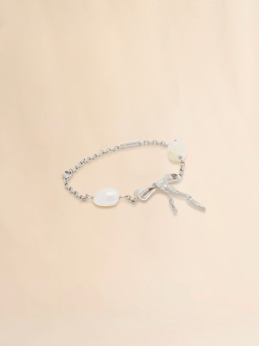 Shiny palladium metal bracelet with bow detail, sculpted to imitate the graceful movement of cascading fabric. Adorned with natural freshwater pearls. Made in Italy MODEL BRMV0221A0M200100N29 COMPOSITION Body: 90% Brass 10% Pearl