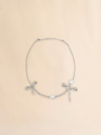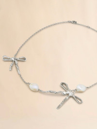 Shiny palladium metal necklace with bow details, sculpted to imitate the graceful movement of cascading fabric. Adorned with natural freshwater pearls. Made in Italy MODEL COMV0517A0M200100N29 COMPOSITION Body: 80% Brass 20% Crystal