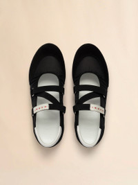 Unstructured and unlined ballerina trainers inspired by the retro aesthetics of football boots. The minimalist design is reminiscent of ballet slippers, ensuring maximum comfort and lightness. Ultra-flexible rubber outsoles with customised Marni branded studs for grip and a distinctive touch of style. The nylon and split leather uppers are finished with elastic across the tops for an easy and secure fit. Marni logo on the front label. Made in Italy MODEL SNZW020800P740600N99