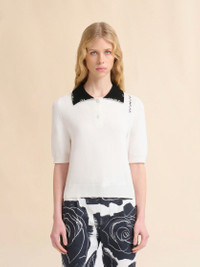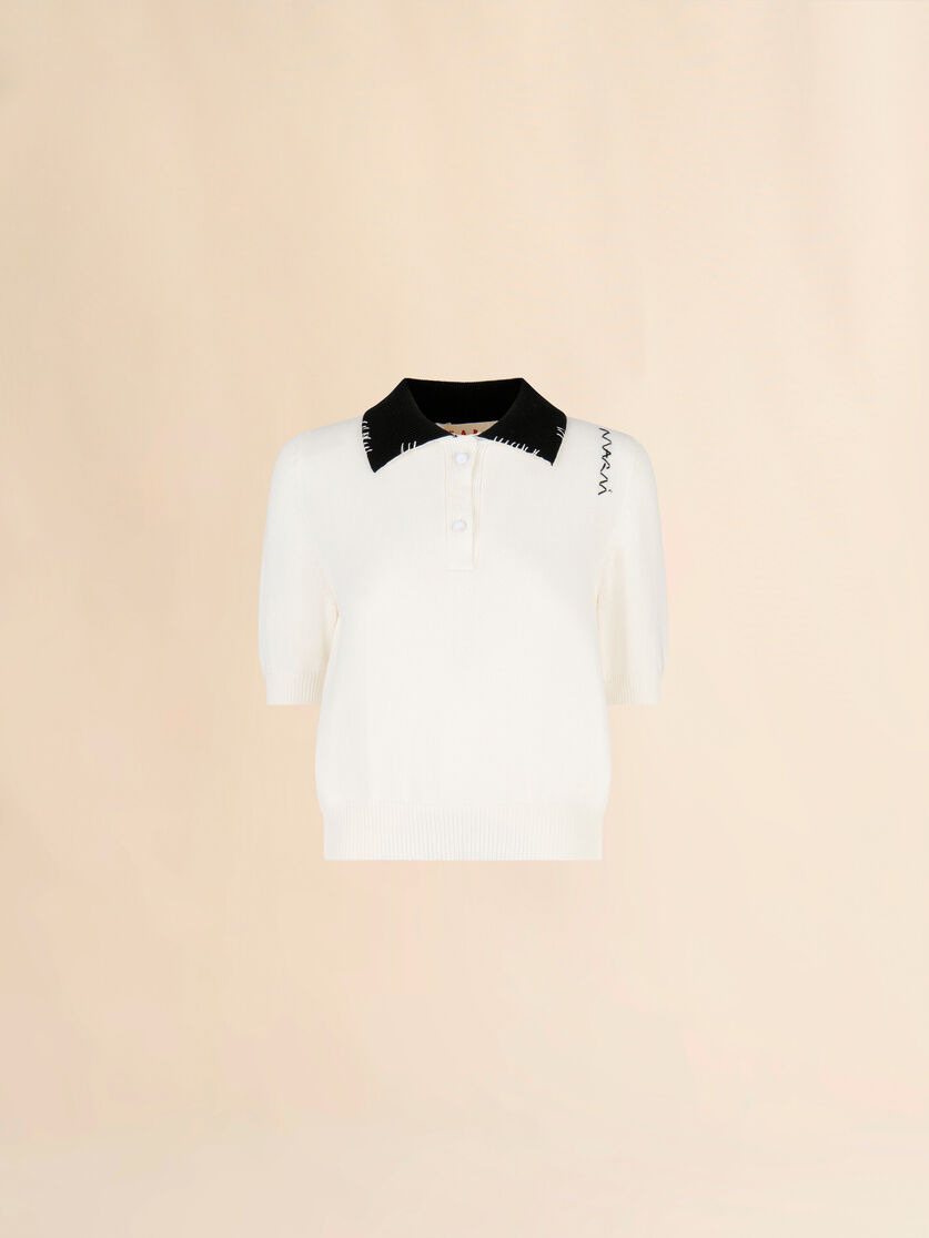 Short-sleeved stockinette stitch polo shirt knitted from cotton. Contrast polo collar with stitching along the edges. Hand-stitched Marni Symbol. Regular fit. Ribbed cuffs and hem. Placket with two buttons. MODEL POMD0049EQUFCN5400W02 COMPOSITION Primary Fabric: 100% Cotton Knit - Secondary Fabric: 100% Cotton Knit