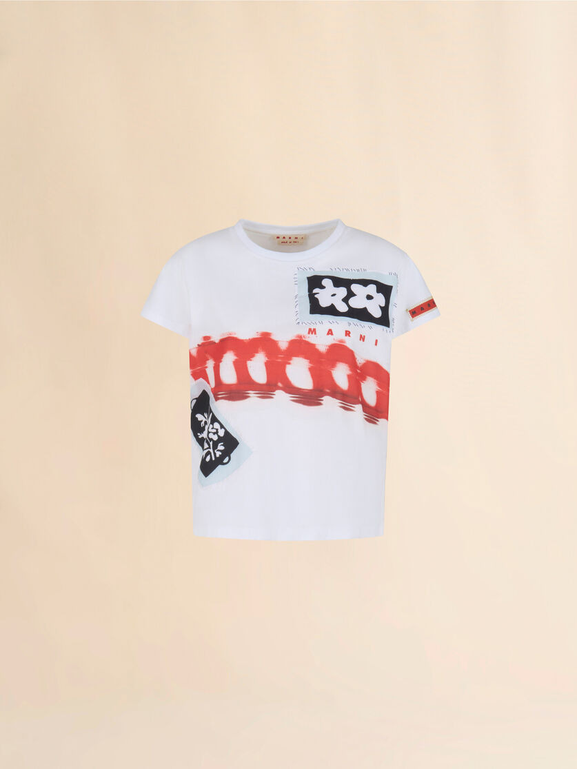 Short-sleeved T-shirt made from cotton jersey. Boxy fit with crew neck. Embellished with prints and patches that embody creativity and individuality. Hand-embroidered Marni Mending. Part of the Artists’ Capsule Collection: an exclusive collab between Creative Director Francesco Risso and artists Soldier Boyfriend and Olaolu Slawn. Made in Italy MODEL THJE0374P0USCY39PRW01