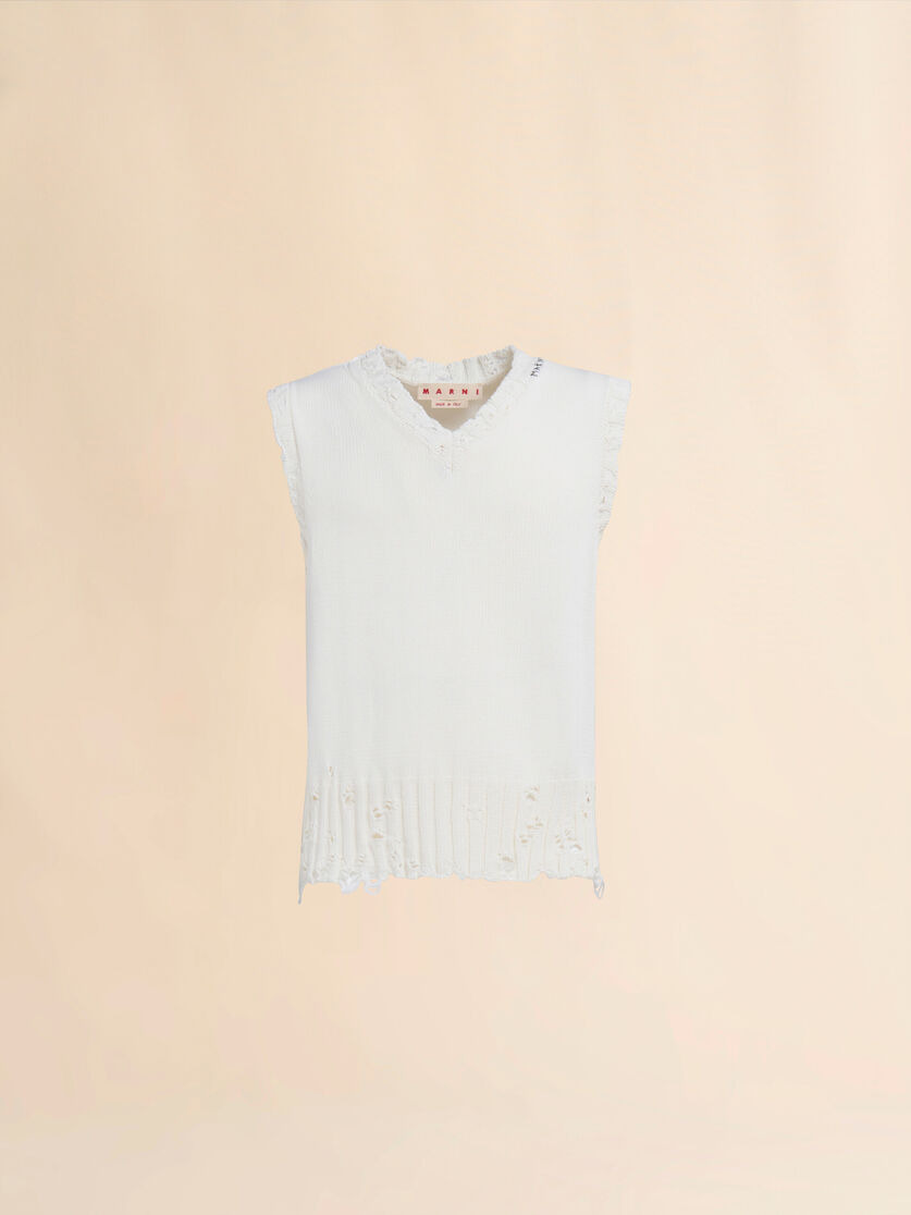 Sleeveless V-neck jumper. Cotton stocking stitch design. Wide ribbed trims with dishevelled detailing. Regular fit. Hand-stitched Marni mending logo with flower detail on the neckline. Made in Italy MODEL CVMG0091A0UFC65200W01 COMPOSITION Primary Fabric: 100% Cotton Knit