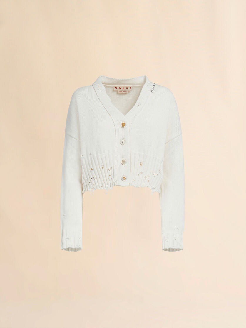 Cotton cropped cardigan. Long-sleeved. V-neck. Horn button closure. Boxy fit with wide ribbed cuffs and hem. Ripped for a dishevelled look. Hand-stitched Marni mending logo with flower detail. Made in Italy MODEL CDMD0223A2UFC65200W01 FIT The model is 5' 11''. The model is wearing size 40 IT. COMPOSITION Primary Fabric: 100% Cotton Knit