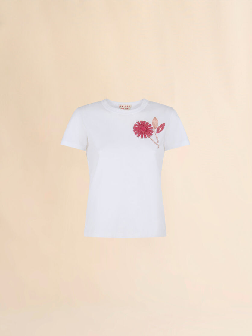 WHITE ORGANIC COTTON T-SHIRT WITH EMBROIDERED CAMELLIA