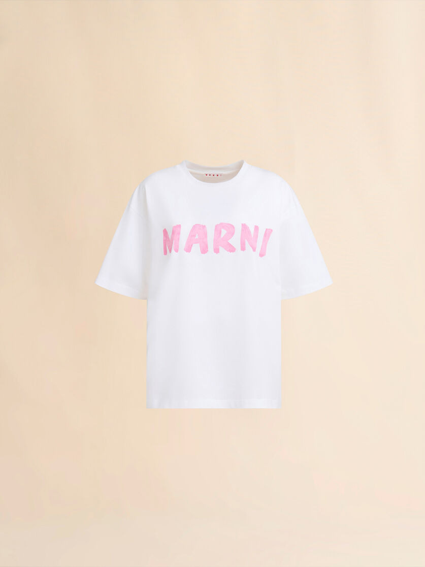 Short-sleeved crew-neck T-shirt made from organic cotton jersey. Boxy fit with short sleeves. Maxi brushstroke Marni logo on the chest. MODEL THJET49EPHUSCS11L5W01 FIT The model is 5' 9.5''. The model is wearing size 40 IT. COMPOSITION Primary Fabric: 100% Cotton Knit CARE INSTRUCTION Hand wash. Do not bleach. Low iron. Do not dry clean. Do not tumble dry.