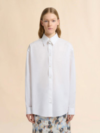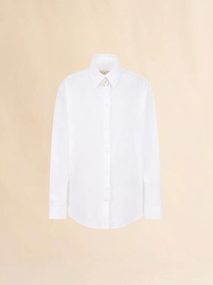 Long-sleeved shirt made from light and breathable organic cotton poplin, harmoniously balanced with an even number of weft and warp threads. Classic collared silhouette, elevated with a logo-engraved D-ring strap at the neck. Finished with an embroidered Marni logo on the back neck. Made in Italy MODEL CAMA0689S0UTC19300W01