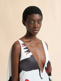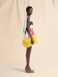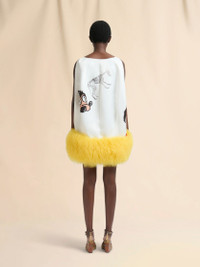 Sleeveless mini dress made from duchess satin. Embellished with a painterly wolves and tulips print created in collaboration with the artists Slawn and Soldier. Plunging V neckline and voluminous balloon silhouette. Soft lamb fur trim at hem and fully lined in a cupro-silk blend. Made in Italy MODEL ABMA1496UZUTP800WTW01