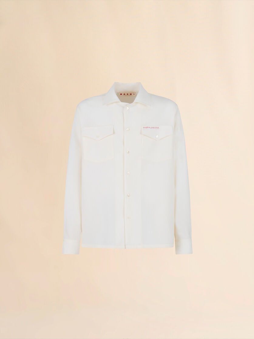 Long-sleeved shirt made from tropical virgin wool. Hand-embellished with Marni Mending stitched and logo around the chest pocket. Relaxed fit with button closure and buttoned cuffs. MODEL CUMU0310S0TW83900W01