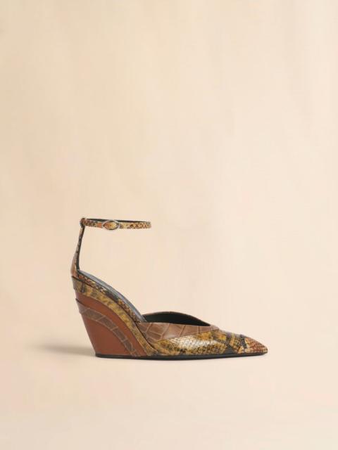 BROWN LEATHER POINTED-TOE WEDGE WITH MIXED ANIMAL PRINT