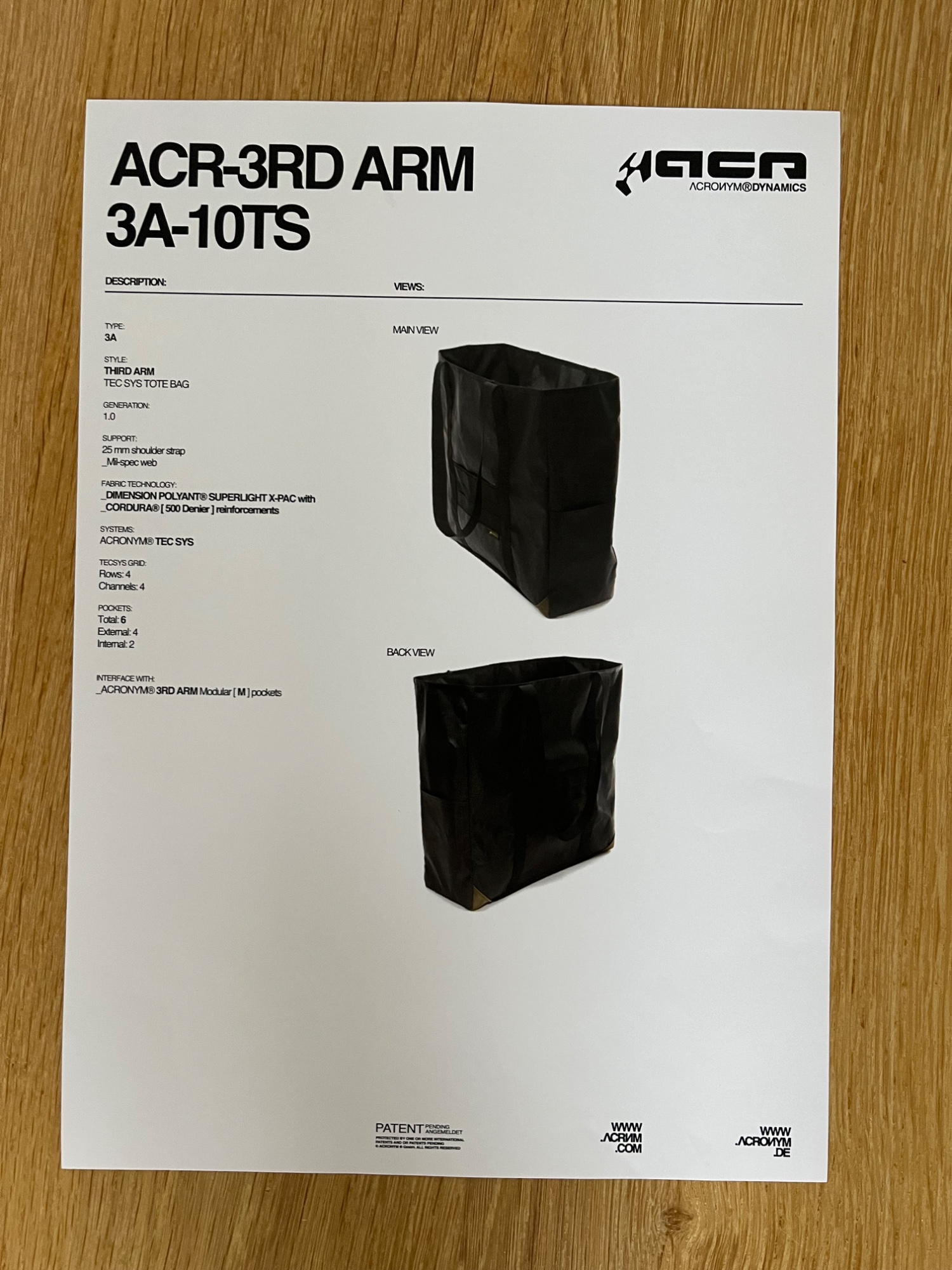 Brand new and never used Acronym 3A-10TS tote bag. 10/10. Black X-PAC Cordura (R). Unique chance. The model has not been manufactured for many many years. 6x pockets and 2x tec sys.