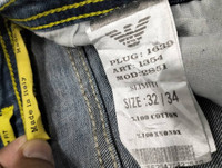 Hello and thank you for your interest in this item and in shopping with us. Before purchasing any item from us, please read "the particulars" below and understand and agree with them. Please note this is Pre-Owned and some items is Vintage and are not new and therefore might have minor imperfections. Authentic Vintage Armani Jeans Distressed Denim Slim Fit Please read a measurement before. Size on Tag : 32/34 Approximately Measurements (inches) : Waist : 32" Rise : 11" Thigh : 9" Outseam Length : 43" Inseam Length : 31" Leg Opening : 7" Material : 100% cotton Condition : Used beautiful distressed pair. Please view all photos ALL SALES ARE FINAL. NO REFUNDS / NO EXCHANGE PAYMENT We accept PayPal payments only as it’s the easiest way for both buyers and sellers. SHIPPING Item will be shipped as soon as payment received and provided full tracking. Thank you and happy shopping