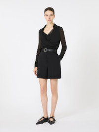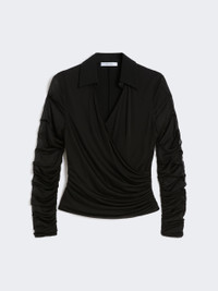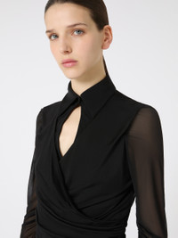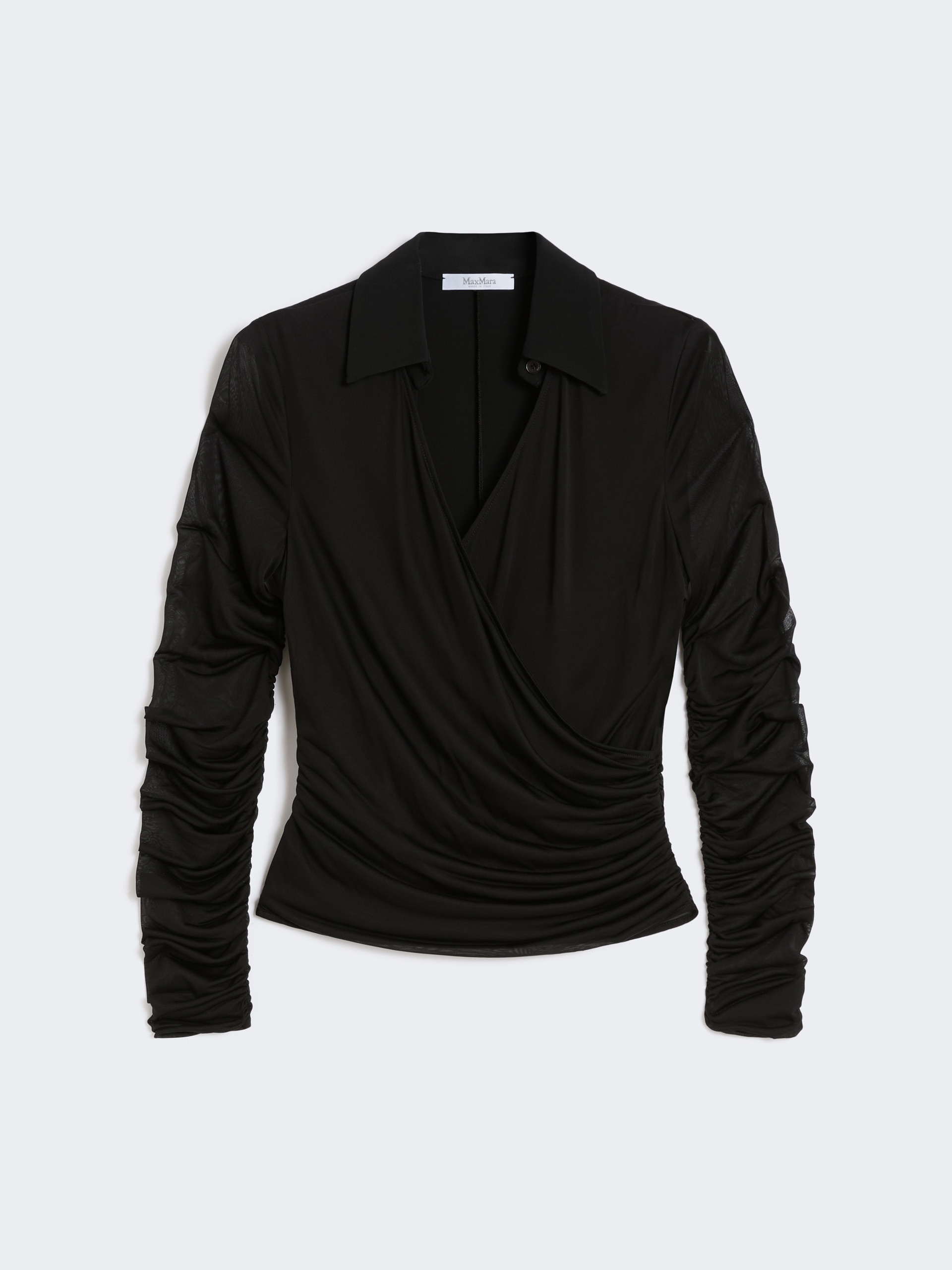 DETAILS Long-sleeved blouse featuring gathers and drapes on the bodice and sleeves. The main fabric of this garment contains raw materials derived from wood cellulose, a fibre produced with respect for the forest Blouse in fluid viscose jersey and overlapped tulle Figure-hugging Wrap-over V-neck with shirt collar Concealed zip fastening at the side Tulle sleeves COMPOSITION AND CARE Jersey fabric 1 100% viscose; jersey fabric 2 93% viscose, 7% elastane; lining 93% viscose, 7% elastane. Do not wash; do not bleach; do not tumble dry; cool iron; professionally dry clean perchloroethylene - mild process; do not wet clean.; iron with a cloth between.; put this item into a string bag before washing it. Distributed by Max Mara S.r.l., registered office in Reggio Emilia (Italy), Via Giulia Maramotti 4, 42124 (IT)
