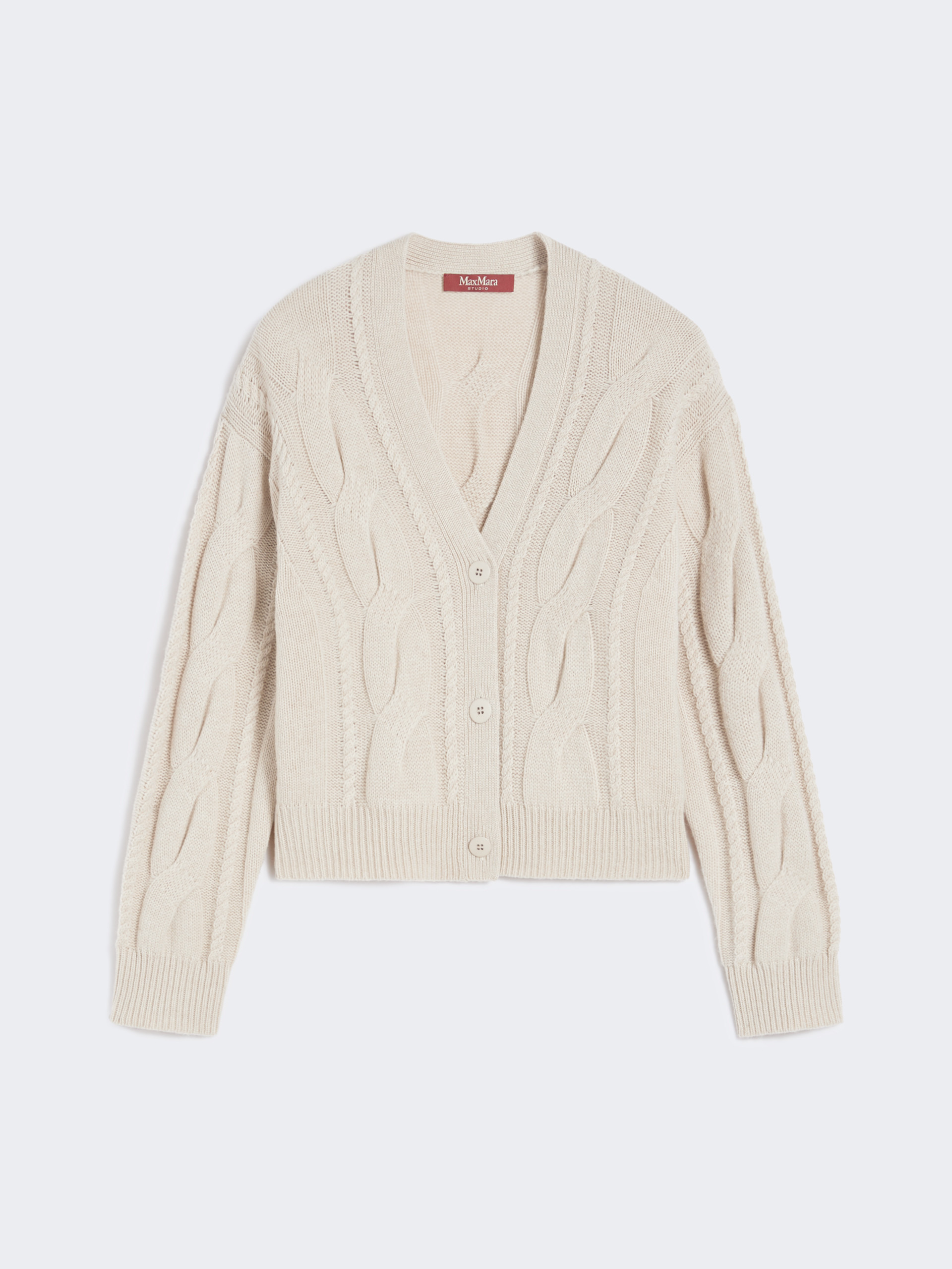 DETAILS Cropped cardigan crafted in a wool and cashmere blend with cable-knit detailing. Its compact construction and balanced proportions lend a contemporary appeal to the style. Cardigan in wool and cashmere yarn Relaxed fit V-neckline Long sleeves with dropped shoulders Front fastening with three visible buttons Rib-knit cuffs and deep trim COMPOSITION AND CARE 80% wool, 20% cashmere. Hand wash cold (40°c max); do not bleach; do not tumble dry; flat drying in the shade; cool iron; professionally dry clean perchloroethylene - mild process; do not wet clean.; iron with a cloth between.; using neutral detergent. Distributed by Max Mara S.r.l., registered office in Reggio Emilia (Italy), Via Giulia Maramotti 4, 42124 (IT)